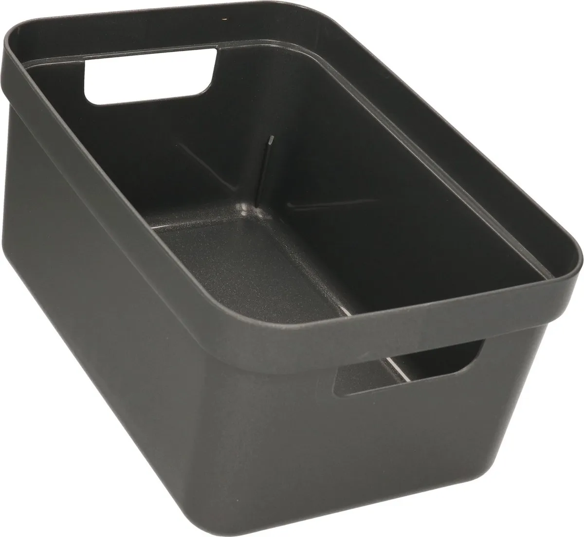 Zwarte opbergboxen/opbergmanden kunststof 25 x 18 x 12 cm.Materiaal: kunststof. Deksel: geen. Inhoud: ca. 5 liter. Opbergdozen/opbergboxen/manden voor het opbergen van spullen in schuur en huis.